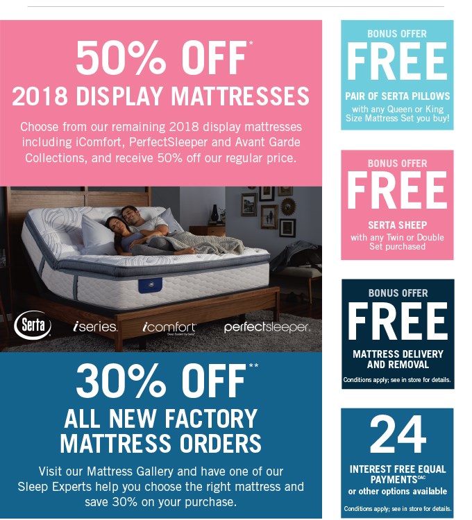 Offers are valid January 15 to February 28, 2019 or while quantities last. Not applicable to previous purchases. Not be combined with any other offer. *Select 2018 display models only. Discount is off the regular retail price of select iComfort, PerfectSleeper and Avant Garde Mattresses. **Applies to all new factory mattress orders. Discount is off the regular retail price. We strive for the utmost accuracy in all our advertising. For complete information on our advertised events, full details can be found at our stores.